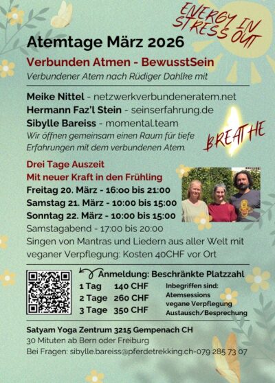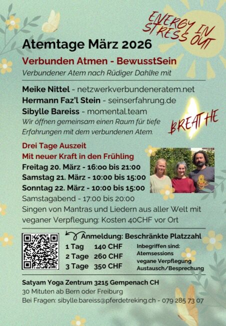 Im Satyam Yoga Zentrum in Gempenach CH öffnen wir gemeinsam einen Raum für tiefe Erfahrungen mit dem verbundenen Atem. Atemsessions, Vegane Verpflegung, Raum das Erlebte zu teilen.